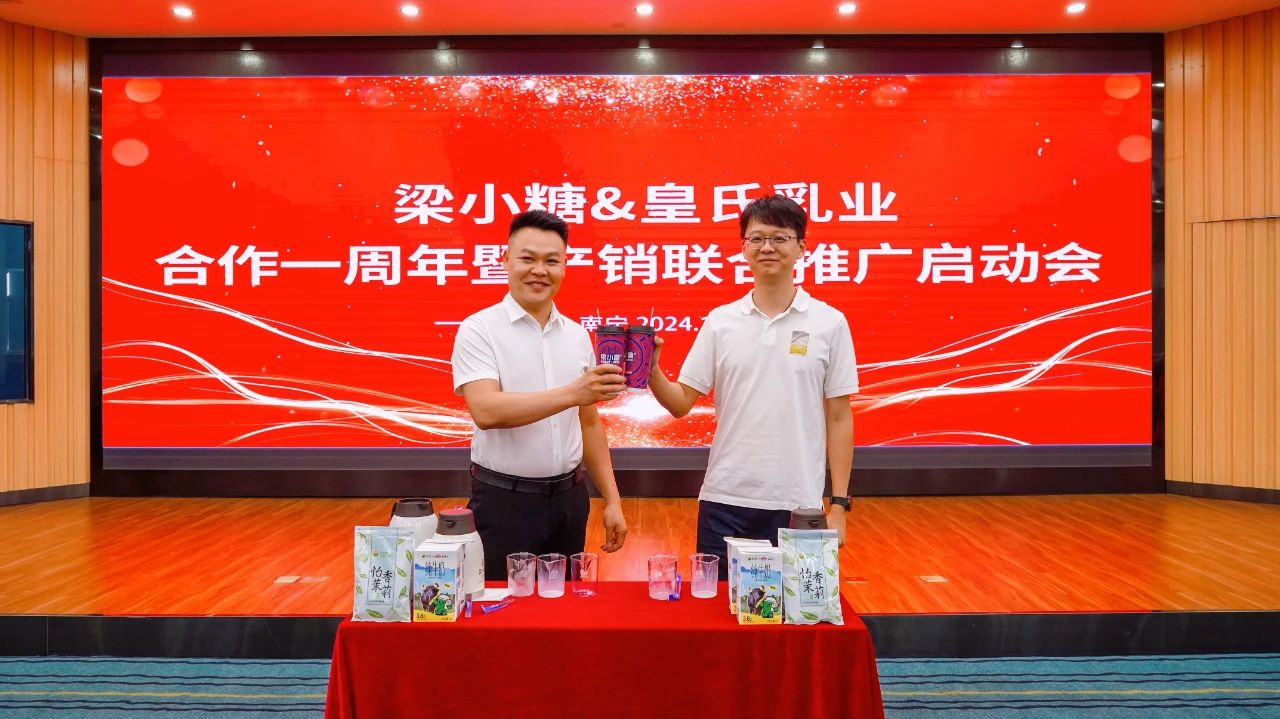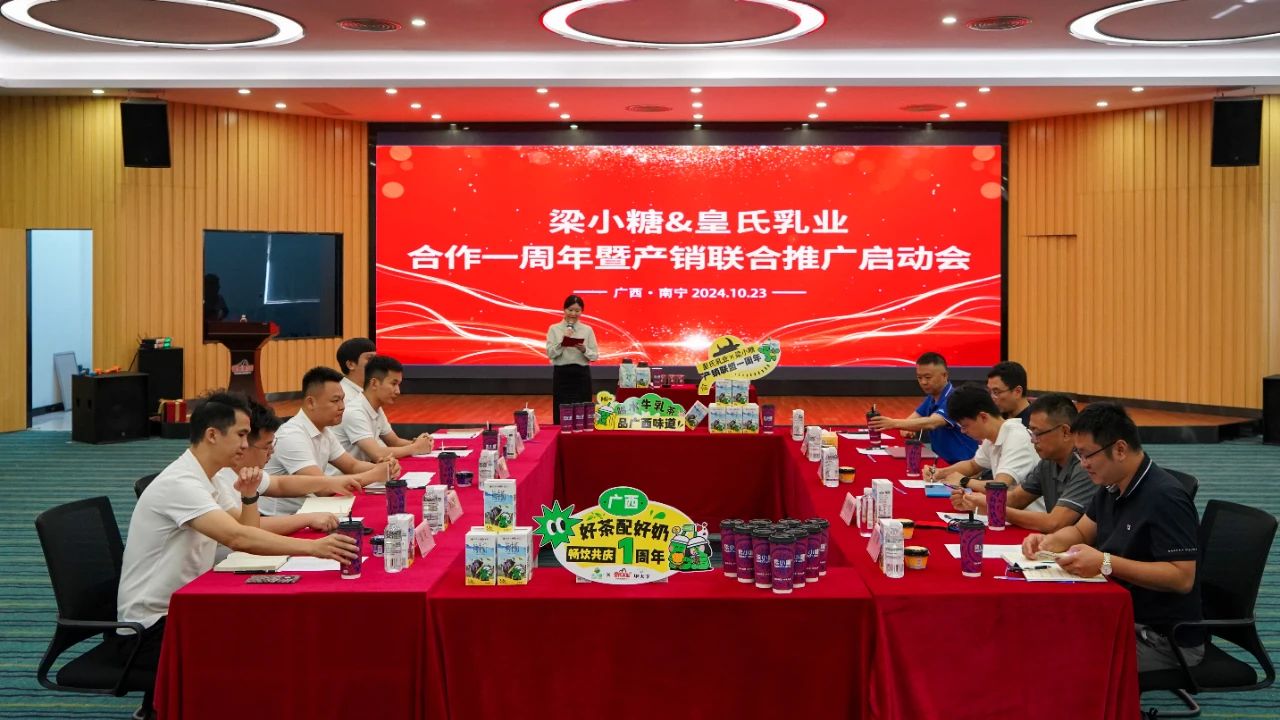 2024年10月23日,在第21届东盟博览会及世界奶茶节的东风吹拂下,广西皇氏乳业有限公司(以下简称皇氏乳业)与广西梁小糖餐饮管理有限公司(以下简称梁小糖)于皇氏集团五楼多功能厅成功举办“合作一周年暨产销联合推广”启动会。皇氏乳业集团常务副总经理黄俊翔、广西梁小糖餐饮管理有限公司董事长梁安军等相关领导出席本次会议。