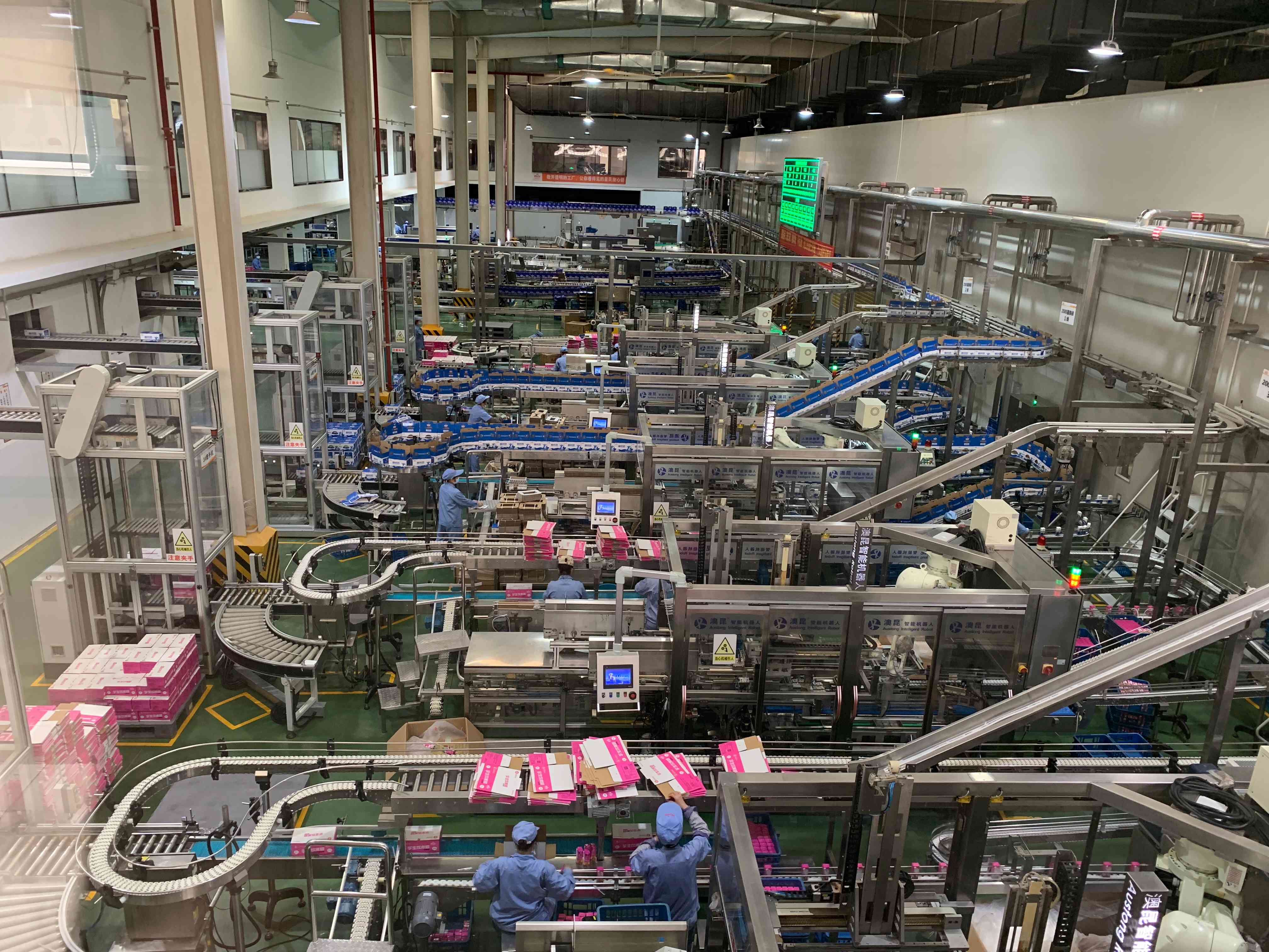 公司拥有华南地区最大的智能化、信息化、节能环保的智能制造单体乳品加工厂,配备26条自动化生产线,工厂立体库由5台码垛机器人组成,负责9条无菌灌装生产线约30个规格的产品码垛。通过乳制品生产线自动化、智能化、信息化改造提升,达到食品企业质量安全保障能力升级改造的最终目标,确保公司成为5年技术领先10年不落后的全自动化的乳品加工基地。